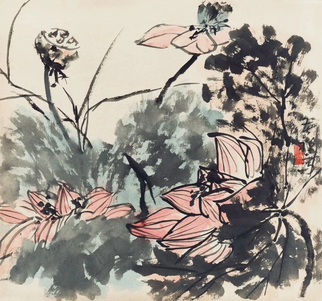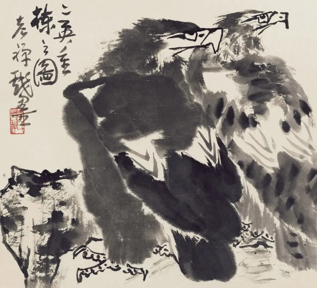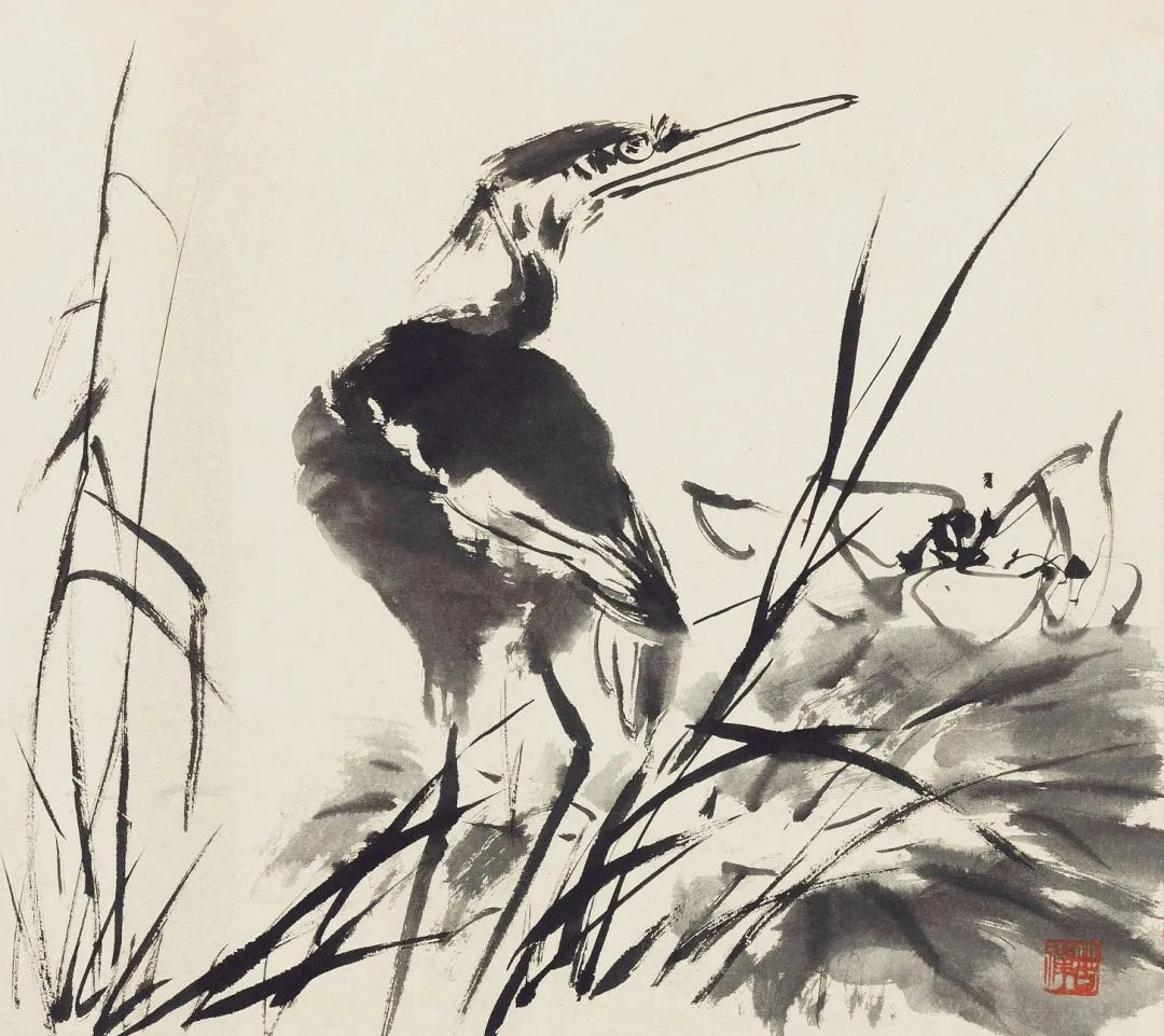 至若山水部分,先生破传统格局,将花鸟入山川。如《荷塘清趣》,远山以淡墨皴擦,若隐若现;近处荷茎挺拔,荷叶如盖,间以鹭鸶点景。笔墨虽简,而气韵生动,似闻荷风送香,鹭鸣清越。此等手法,盖得八大山人遗意,而更添浑厚。