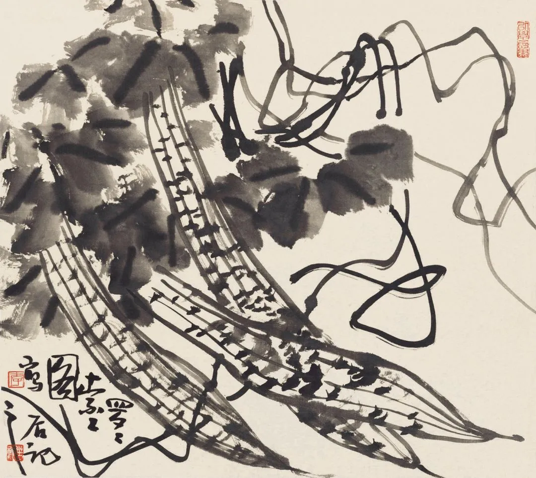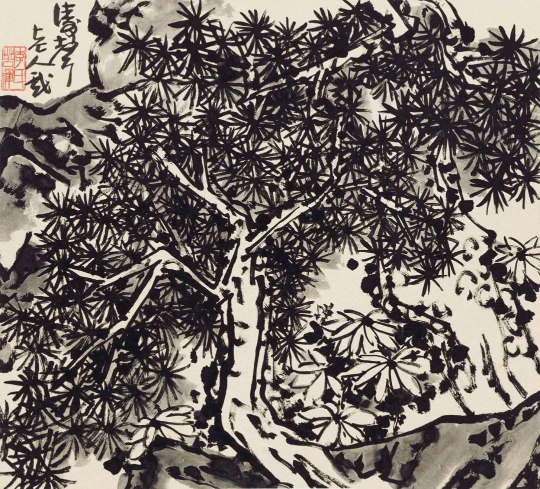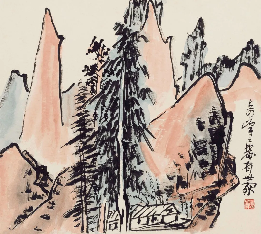 至若山水部分,先生破传统格局,将花鸟入山川。如《荷塘清趣》,远山以淡墨皴擦,若隐若现;近处荷茎挺拔,荷叶如盖,间以鹭鸶点景。笔墨虽简,而气韵生动,似闻荷风送香,鹭鸣清越。此等手法,盖得八大山人遗意,而更添浑厚。